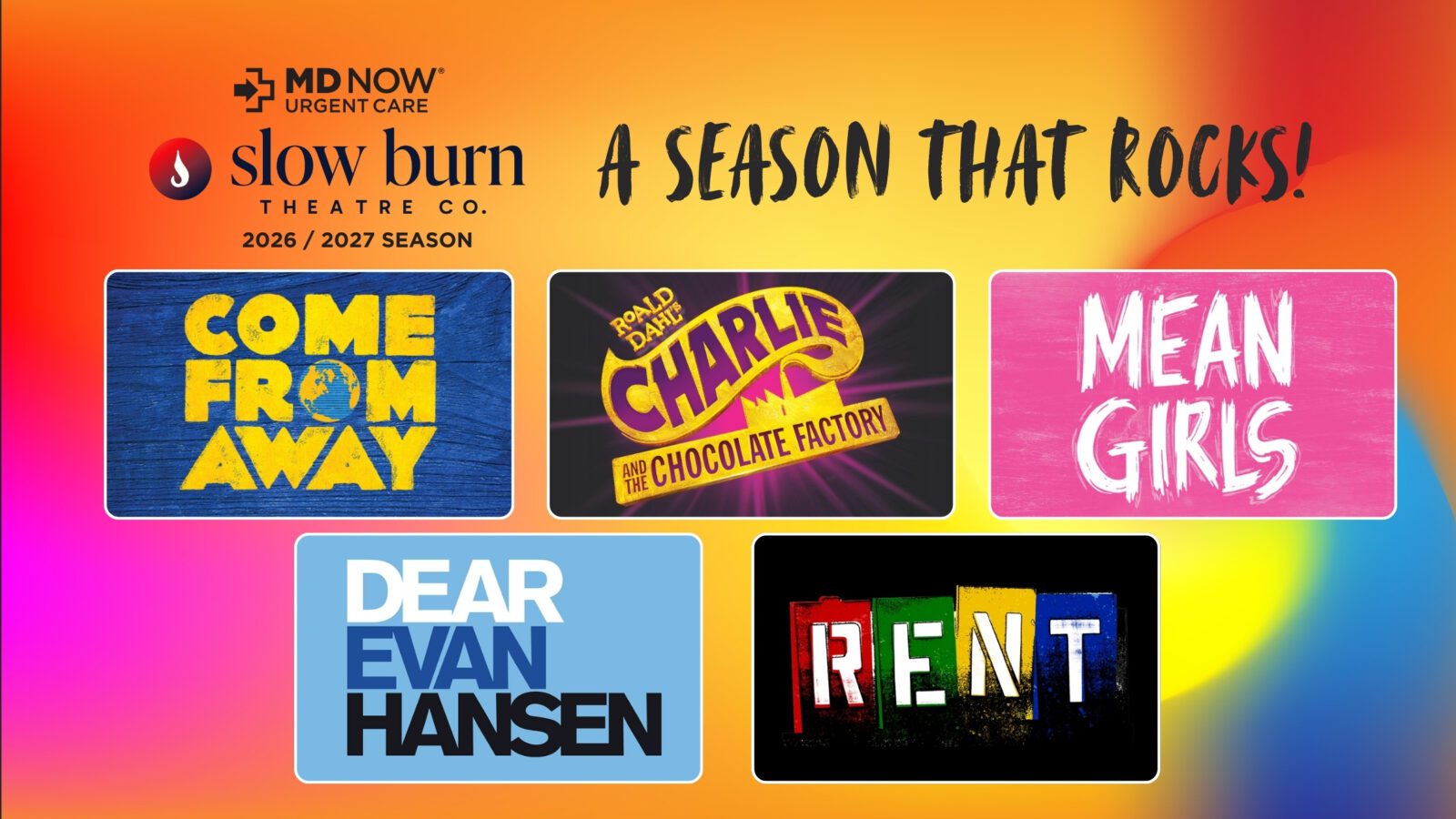 Announcing MD Now® Slow Burn Theatre Company’s 2026/2027 Season, featuring a dynamic lineup of five powerful and crowd-pleasing musicals celebrating connection, courage and self-discovery. Presented in the Amaturo Theater at the Broward Center for the Performing Arts, the season includes Come From Away; Roald Dahl’s Charlie and the Chocolate Factory; Mean Girls; Dear Evan Hansen; and Rent.