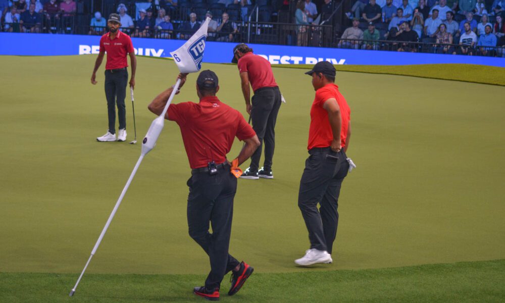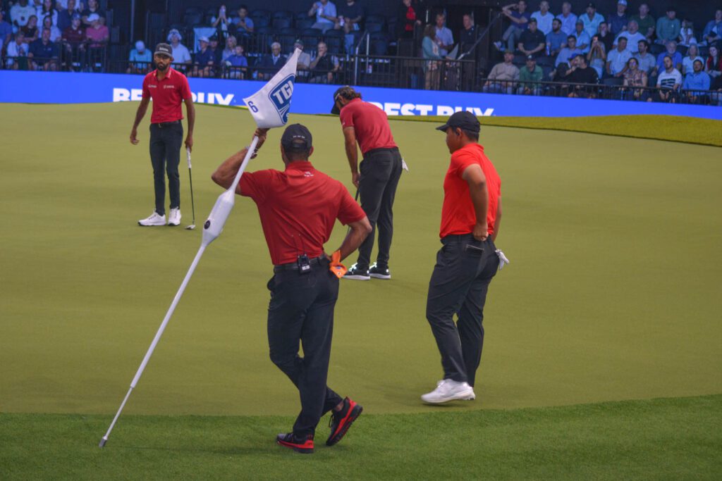 One of the biggest highlights came on the third hole when Tiger Woods threw the Hammer for Jupiter. When the Hammer is thrown, the hole is worth two points instead of one if the opposing team accepts it. If the challenge is declined, the team that threw the Hammer automatically wins the hole and earns one point. Each team receives three Hammers per match, adding another strategic layer to the competition. Boston accepted the challenge but lost the hole, giving Jupiter a 3–1 lead.