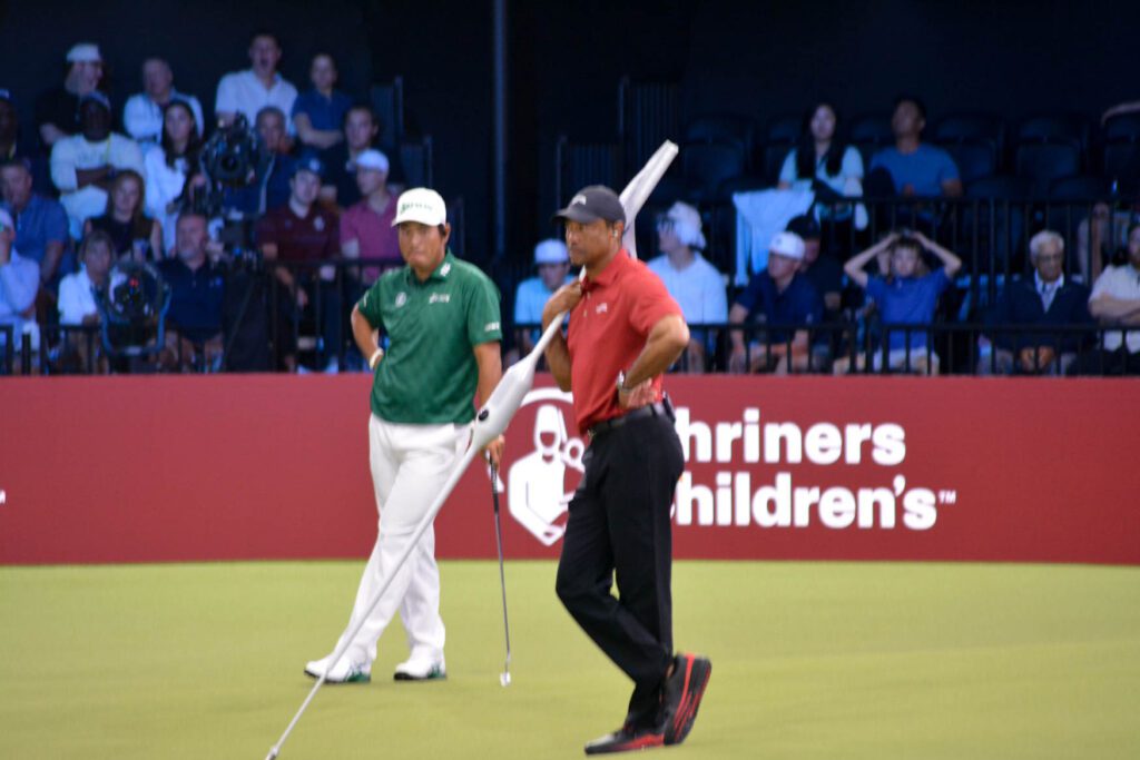 The last hole featured Bradley Keegan representing his hometown Boston against Tom Kim on a par five. Tom hit a strong drive down the fairway, while Bradley left an opening by landing in the sand trap. Tom followed with a solid approach shot onto the green and energized the already electric crowd with animated gestures as he walked toward it. Bradley responded with an incredible putt, increasing the pressure on Tom. To heighten the drama, Boston even called a timeout to “freeze the kicker”—or in this case, the putter. Despite the pressure, Tom sank the putt and sent the match into overtime.