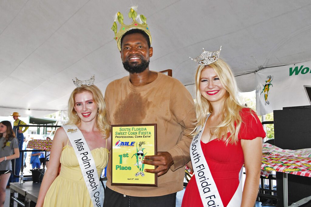 At the 2025 Sweet Corn Fiesta, Gideon Oji won back his Sweet Corn crown from Miki Sudo. He consumed 52 ears of corn in 12 minutes! The legendary Carmen Cincotti set the record of 61.75 ears of corn back in 2017. The total prize purse is $6,100 broken down as follows: 1st – $2,500, 2nd – $1,500, 3rd – $1000, 4th – $600, 5th – $300, 6th – $200.
