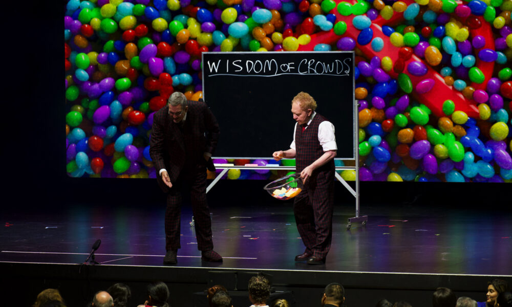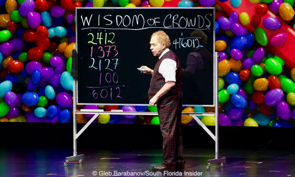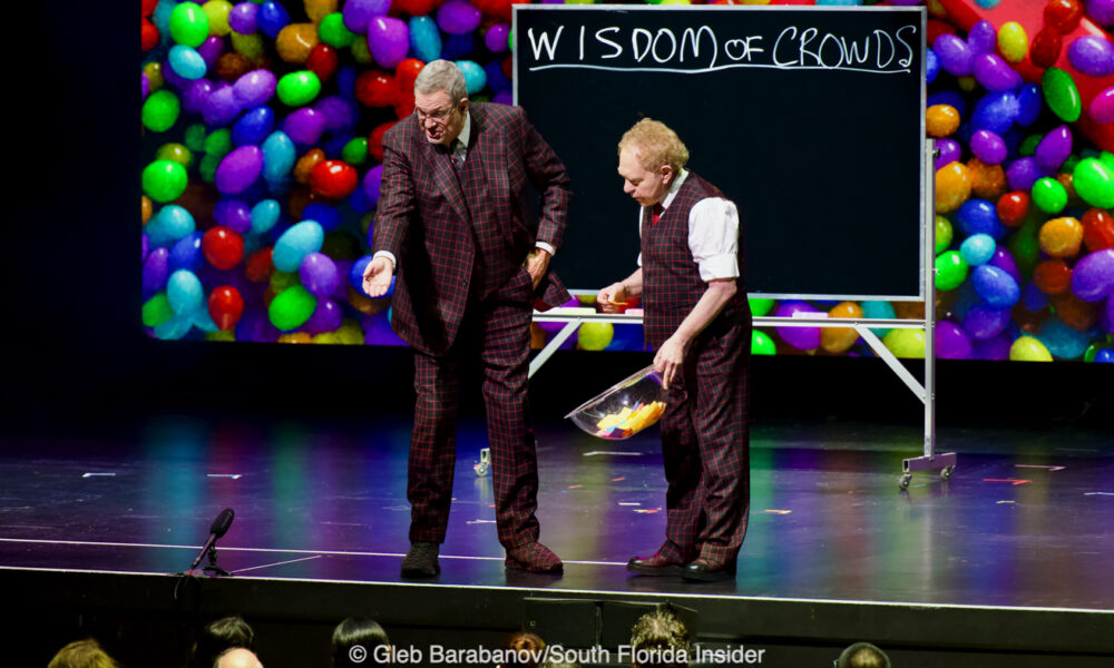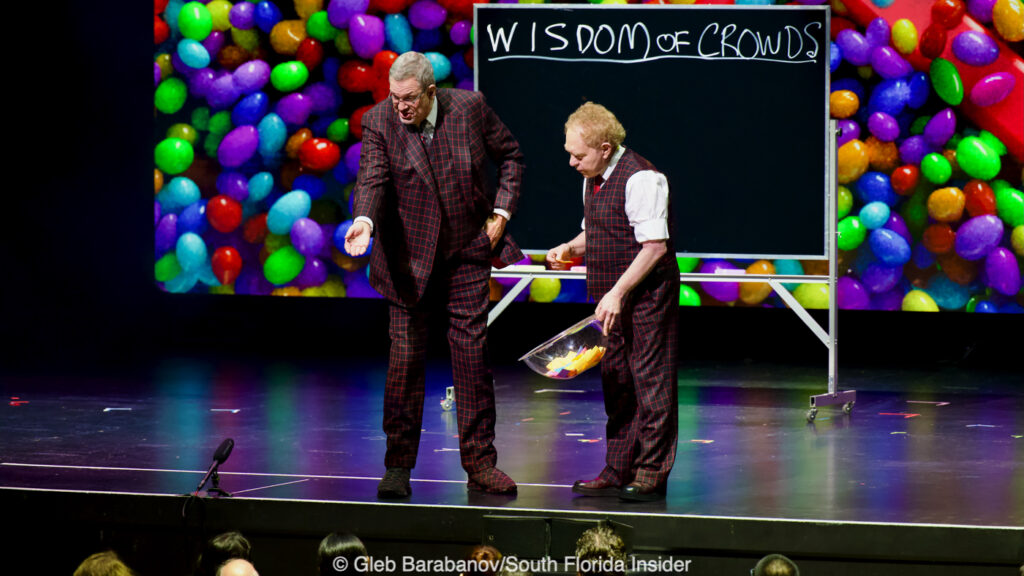 From the moment Penn Jillette’s booming voice filled the auditorium and Teller stepped silently into the spotlight, the audience understood they were not just mere spectators, but rather essential participants in the evening’s alchemy. This has always been the duo’s signature, and on this golden anniversary night they leaned into it once again with visible joy. Volunteers were summoned to the stage repeatedly throughout the performance, transforming hesitant strangers into momentary stars that often got to go home with a small trinket for their troubles. A young girl from the front row found herself verifying Teller’s silk-cutting skills with wide-eyed seriousness, while a woman plucked from the back became a coin-counting accomplice in a two-part jelly-bean counting routine that drew loads of laughter from the crowd.
